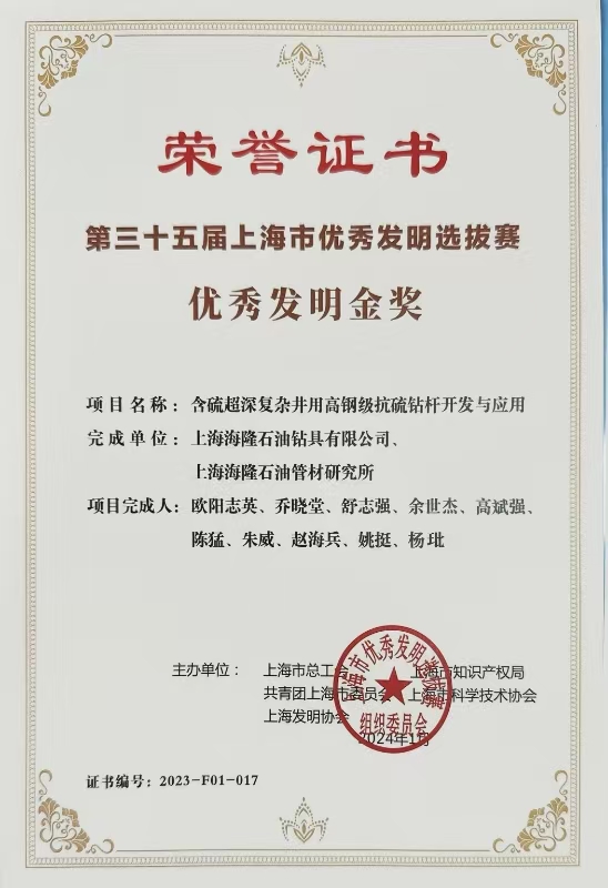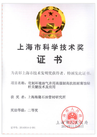 石油鉆桿耐磨耐蝕及防刺漏技術上海市科學技術獎二等獎